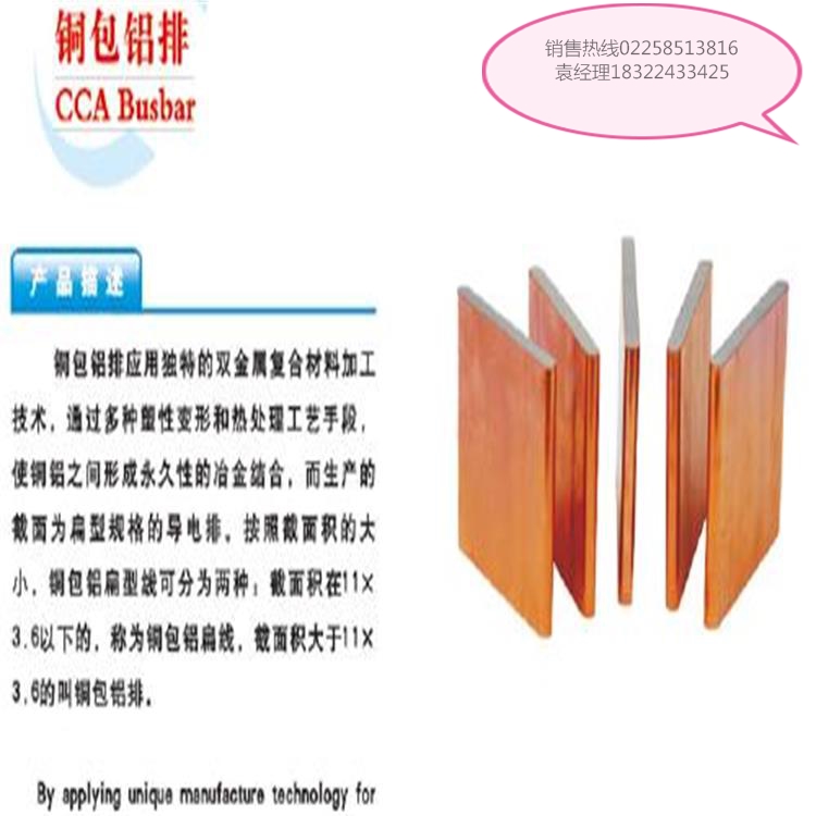 優點1、良好的導電性:銅鋁體積比為15%的銅包鋁排電性能,與銅排相比其交流載流量是純銅的85%。2、重量輕:銅包鋁排的密度僅為純銅排的37%-40%,同等重量的長度(體積)是純銅排的2.5-2.7倍。3、良好的力學性能:具有良好的抗拉強度,可彎曲性和延伸率。4、牢固的銅鋁間結合:兩種不同金屬材料之間在各種環境溫度中達到永久性的原子晶間結合,并且銅層(鍍錫、鋅層)分布均勻,不存在任何物理缺陷。5、良好的延展性和可靠性:經過特殊的熱處理工藝,具有一定的可塑性,有利于沖孔、剪切、彎曲加工產品不開裂、不分離。為了提高抗腐蝕性能,可在銅層表面進行鍍錫、鍍鋅處理。6、Jia的選擇性:節省銅材,極大降低生產配套成本,綠色環保,無任何污染。注:可根據用戶加工各種寬度和厚度的銅鋁復合排。銅鋁復合排,可專門用于替代銅排,鋁排。廣泛應用于。自動化,冶金,高低壓電器,建筑行業及冶金行業。該產品采用國外先進的雙金屬復合材料技術,質量穩定性能可靠是一種高科技的節能型產品。