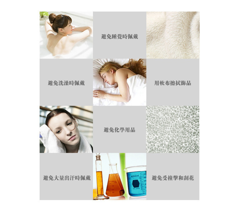 潮濕的環境包括:洗澡、洗臉時不配帶、大量出汗時不佩帶、存放前應用干布擦干;放置首飾的首飾盒內應當放1顆干燥劑;