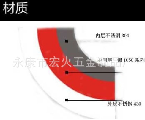 本產品采用高級不銹鋼,304、純鋁、430三層復合鋼材,中間用鋁能大量儲熱,復合鋼一體成型,內外采用不銹鋼,使鍋體耐腐蝕、耐高溫、抗磨耐壓,真正延長壽命。鍋體受熱均勻,快速導熱同時減少油煙。易潔、易刷、不易粘,更節能。