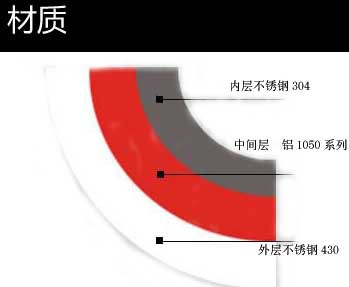 外層不銹鋼430(18/0),硬度較高,含有碳成分,因此有磁性,可用在電磁爐上,而且不銹鋼430的光潔度也非常好。