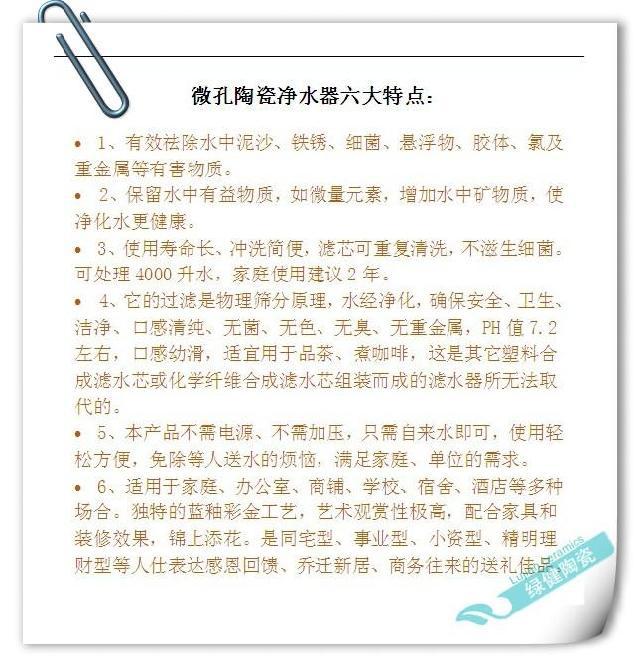 【配置】:陶瓷外缸、內膽、缸蓋、微孔活性炭陶瓷濾芯、不銹鋼龍頭、木腳。