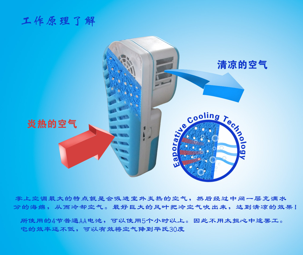 1、把隨機配帶的海綿充份弄濕后(以不滴水為標準)放入機子后面的海綿專用區內。打開空調,即可實現冷風制冷。