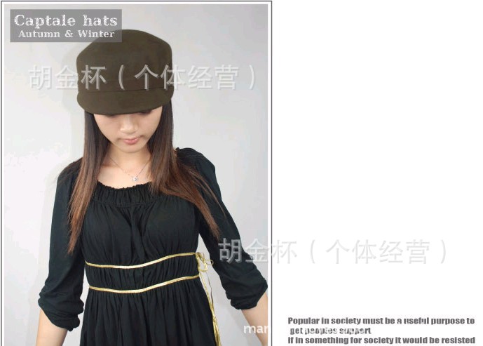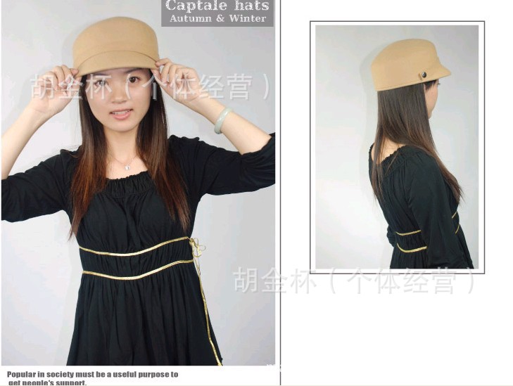 (聲明:本帽子是戴在頭頂上的這種風格,不是像鴨舌帽那樣戴在前額頭上的哦,所以不會太大,我們的帽子都是紙箱包裝的,但是有的快遞也會稍微弄的扁了一點,但是,由于是純羊毛的不怕,用手一撐就好,很嚴重的,回去噴點水,下面用圓的東西撐起來帽子,用熨斗燙一下就好了,恢復原樣!