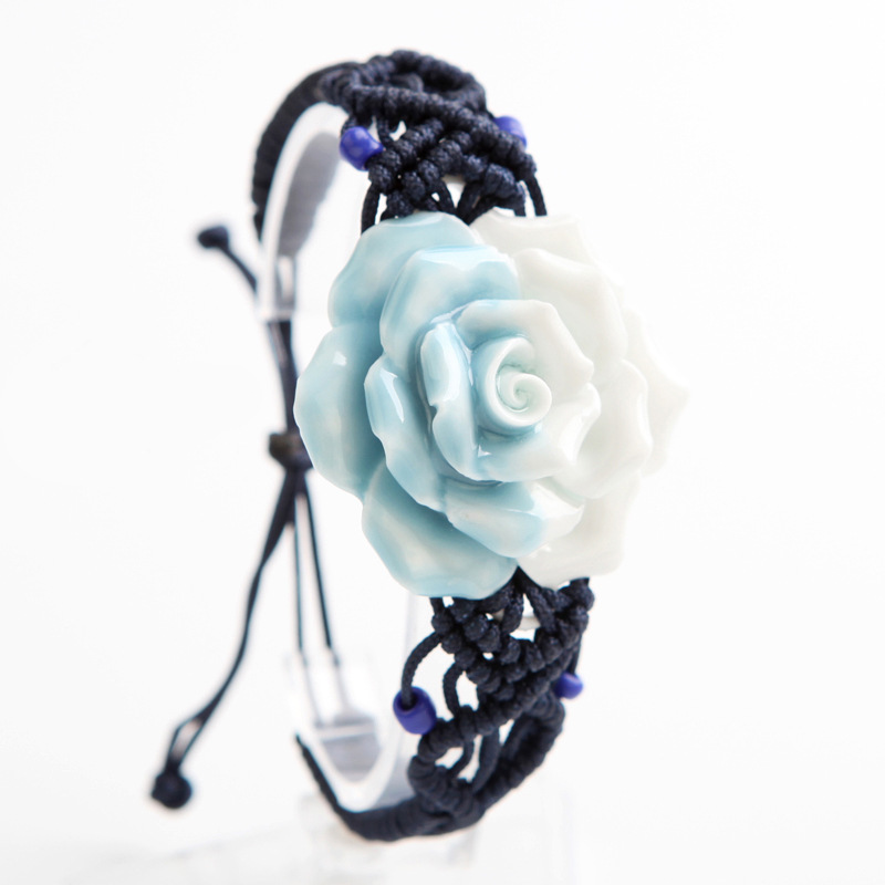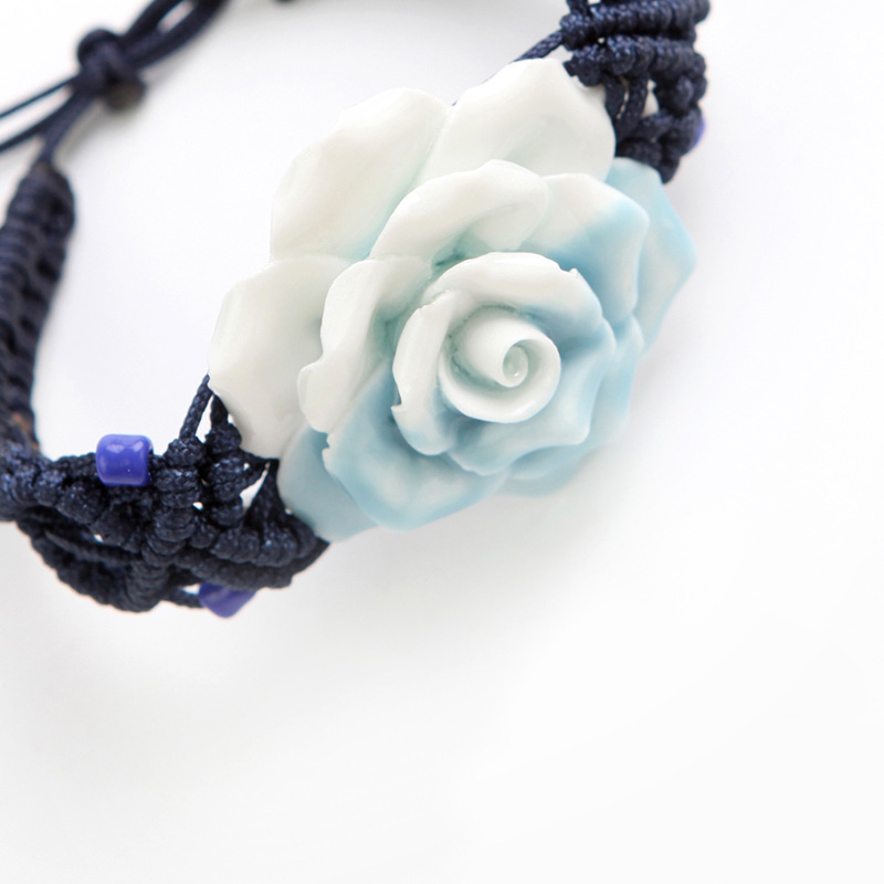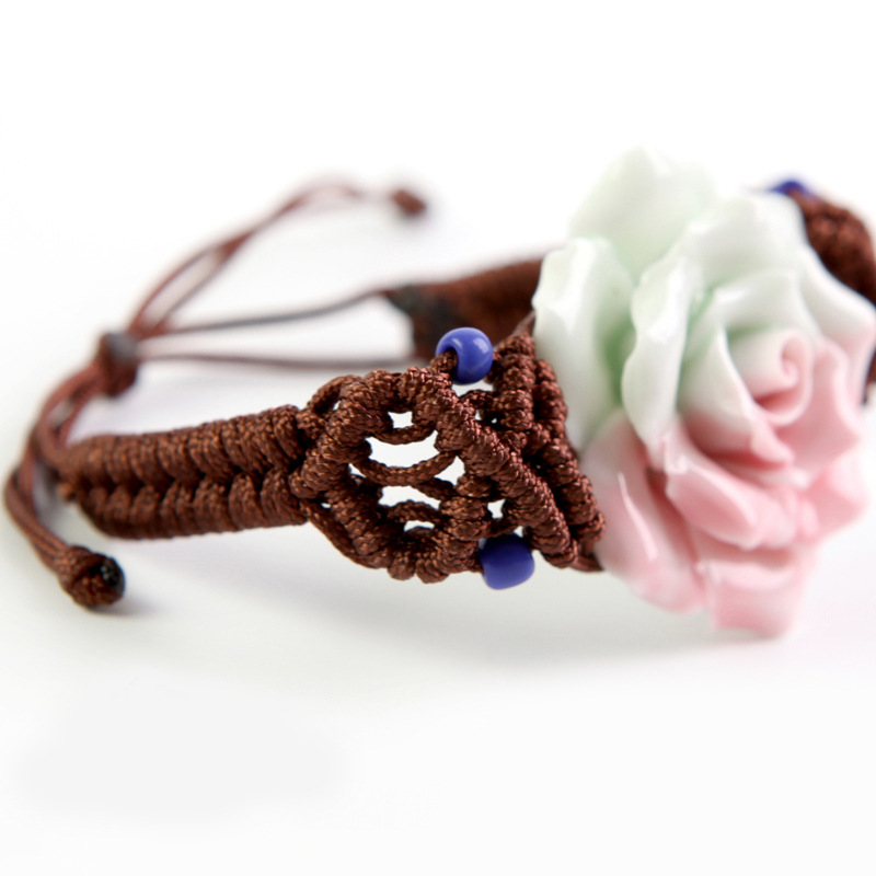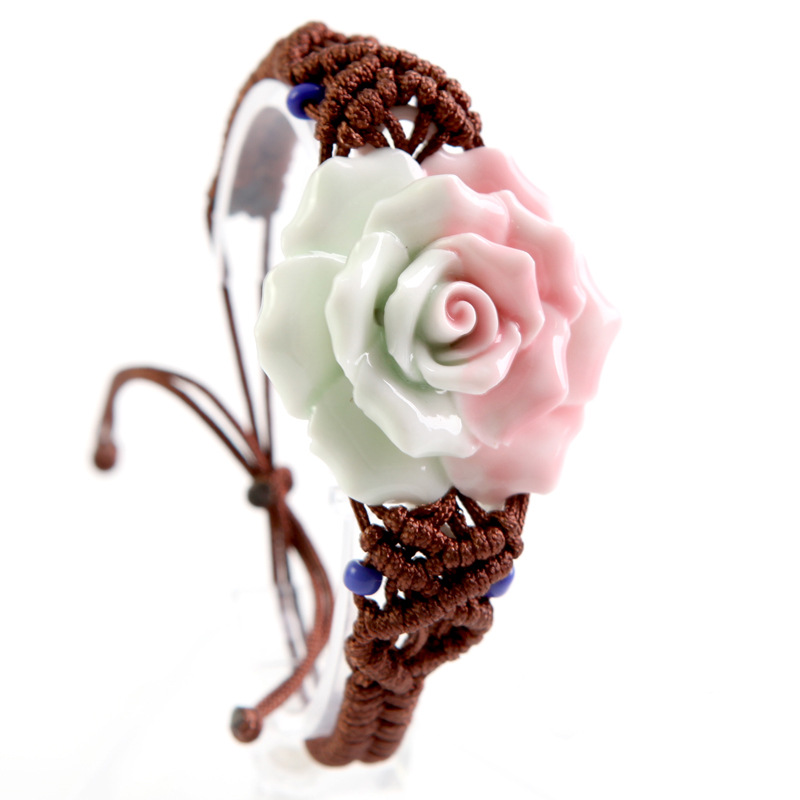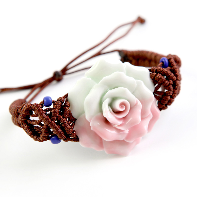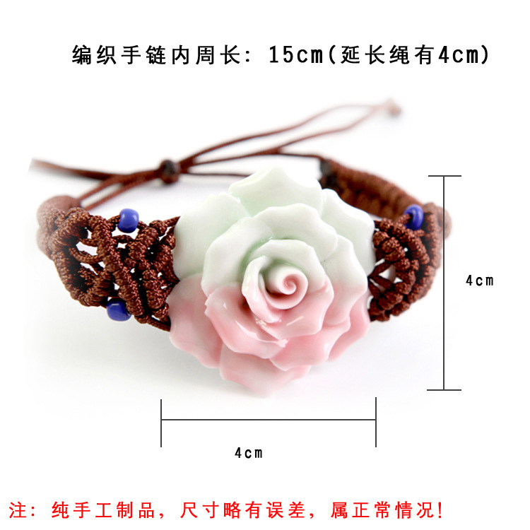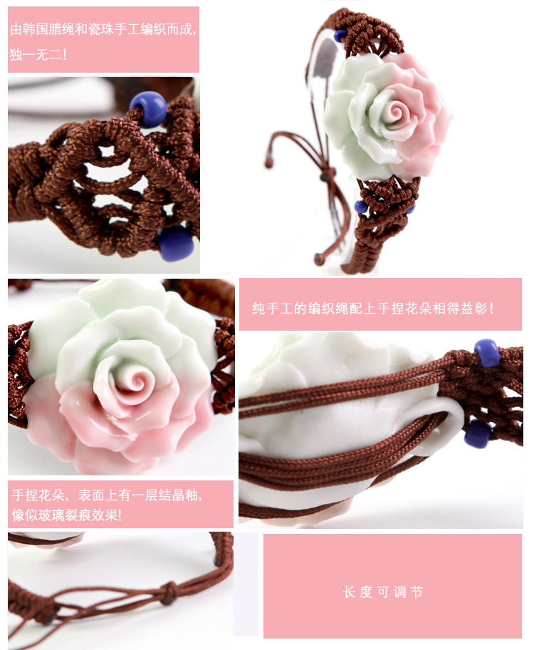 手工捏花手鏈手鐲 陶瓷首飾品 粉月季玫瑰花 女 民族編織
