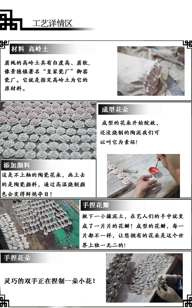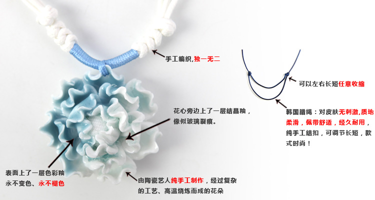 本店的陶瓷首飾均由陶瓷藝人純手工制作,經過復雜的工藝、高溫燒煉而成,是繪畫藝術、手捏藝術、雕塑藝術以及窯火技藝的完美結合,每一件陶瓷首飾,都是一件精美的陶藝品。