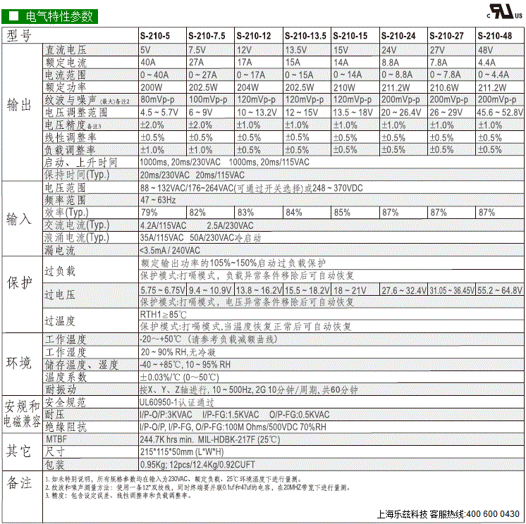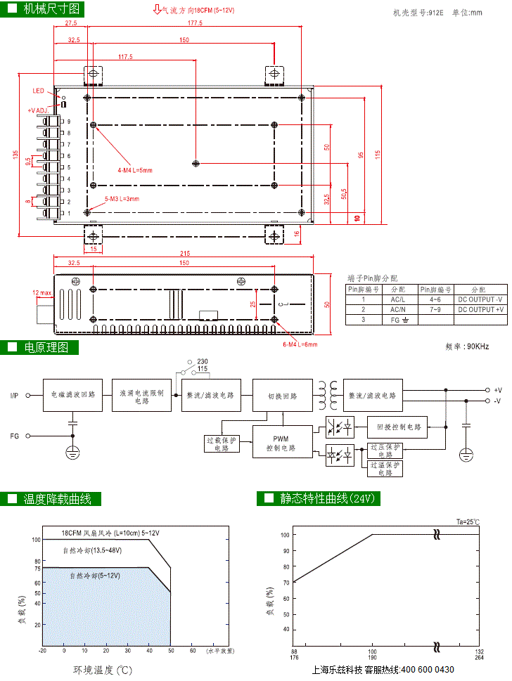 ■ 主要特點開關選擇交流輸入電壓范圍有短路保護/過載保護/過電壓保護/過熱保護國際安規認證UL/CUL上海樂茲科技,客服熱線400 600 0430自然通風冷卻90KHz固定開關頻率100%滿載老化測試LED指示電源工作狀態采用無鉛制程,符合環保RoHS要求臺灣明緯品牌,蘇州工廠生產2年質保 ■ 主要參數直流輸出范圍5V,0~40.0A輸出電壓精度±2%紋波80mV效率79%輸入電壓范圍由開關選擇88~132VAC/ 176~264VAC/或 248~370VDC輸入浪涌電流冷啟動,115V時為35A/230V時為50A電壓調整范圍額定輸出電壓的±10%過載保護過電流點在105%~150%時斷開,自動偵測自動復原過電壓保護額定輸出電壓的115%~145%時動作,自動偵測自動復原啟動,上升時間230VAC滿載時100ms,50ms企業QQ號400-600-0430絕緣特性輸入端與輸出端間: 3KVac,輸入端與外殼間: 1.5KVac, 輸出端與外殼間: 0.5KVac,1分鐘工作溫度-20~ 50℃(參考溫度降載曲線)抗震動性10~500Hz,2G 10分鐘/ 周期, XYZ各軸各60分鐘安規認證通過UL60950-1認證平均無故障時間≥24.47萬小時, MIL-HDBK-217F(25℃)接線方式9P/9.5mm端子排外形尺寸215×115×50mm (長×寬×高)機殼號912E重量及包裝0.95公斤/只; 每箱12只/ 12.4公斤/ 0.026立方米