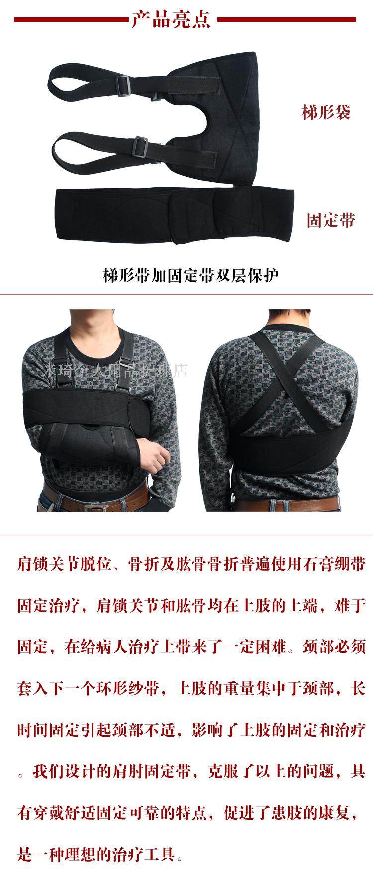 主要用于肩鎖關節脫位、骨折幾肱骨尺橈骨骨折的固定治療。 肩鎖關節脫位、骨折及肱骨骨折普遍使用石膏繃帶固定治療,肩鎖關節和肱骨均在上肢的上端,難于固定,在給病人治療上帶來了一定困難。頸部必須套入下一個環形紗帶,上肢的重量集中于頸部,長時間固定引起頸部不適,影響了上肢的固定和治療。我們設計的肩肘固定帶,克服了以上的問題,具有穿戴舒適固定可靠的特點,促進了患肢的康復,是一種理想的治療工具。