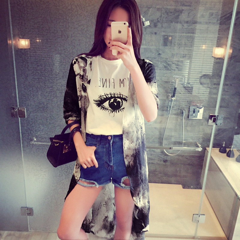 歐美代購款2015夏裝新款時尚成熟中長款無扣水墨風雪紡衫空調衫女