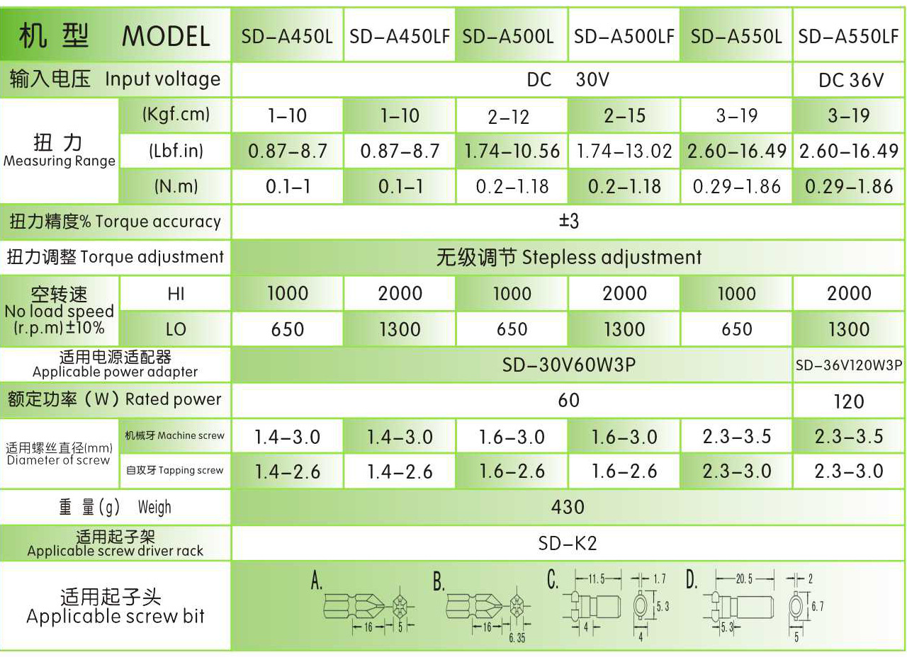 •全自動電動螺絲刀,當螺絲鎖緊達到設定扭力時,離合器會自動跳脫,馬達會自動斷電并及時剎車,讓電動螺絲刀停止運轉。•無碳刷電機,扭力輸出更加穩定,適合在無塵作業環境使用,穩定性高,操作簡單,起子可以長時間使用。•采用無觸點開關,不需要更換易耗品,超長使用壽命。•操作簡單,扭力穩定,提高工作效率,馬達長時間使用不疲乏,適合在流水線工作中使用。•扭力調整由扭力調整環左右旋轉無級調節,轉速可分Hi/Lo開關兩段調節。•體質小,重量輕,低噪音,采用流線型8991-觀設計,性能穩定,電機不需要保養與維護,起子可以長時間使用。•扭力精度高,采用無級式扭力調整,操作簡單,適用于一般電子電器產品燈具、小家電、玩具、電腦周邊配件等加工裝配作業。 技術參數: