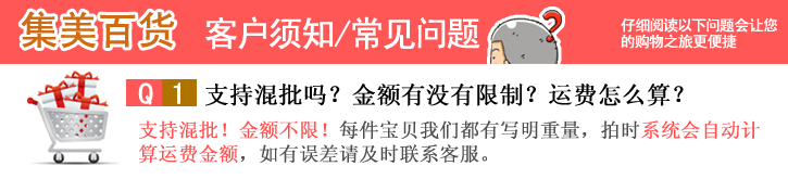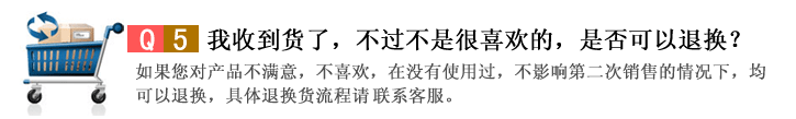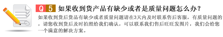 5.質量問題:能拆開的東西發貨前我們都會盡量拆開再三核對和嚴格檢查,尺寸和顏色問題不是我們發貨疏忽引起的,如需調換運費由買家承擔,如果確實在收到后發現質量問題請在收到的48小時內及時聯系我們,提供相關圖片證據,一定為您妥善解決,郵費我們承擔。注意:內褲和襪子不接受任何使用后的調換和退貨!請在適用前仔細檢查!由于每個顧客要求不同,是不可能做到在任何顧客眼里都是十全十美的。某些絲毫不影響穿著適用的小瑕疵希望各位不要太認真計較。