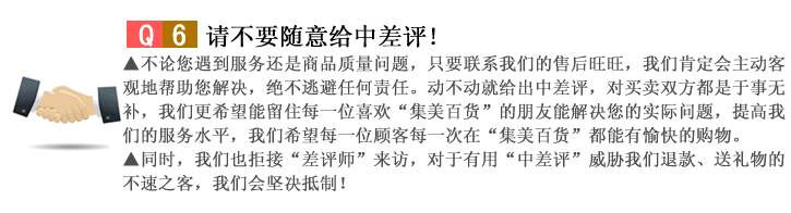 6.關于評價:我們會盡一切的努力以價格質量,以德服人,創造公正和諧的購物環境,升級國民的購物環境和習慣,網上購物好處多,需要大家共同珍惜共同去努力維護,用良心去對待每一筆買賣行為!我們將努力追求100%好評,十分歡迎大家對我們合理評價。確實交易出了問題,先要取得溝通,化解誤會和矛盾,可以協商解決,是我們的疏忽和責任我們會認真負責對待。理解和尊重是相互的!對某些心懷不軌和陰謀的買家請遠離這片凈土!聯系我們: