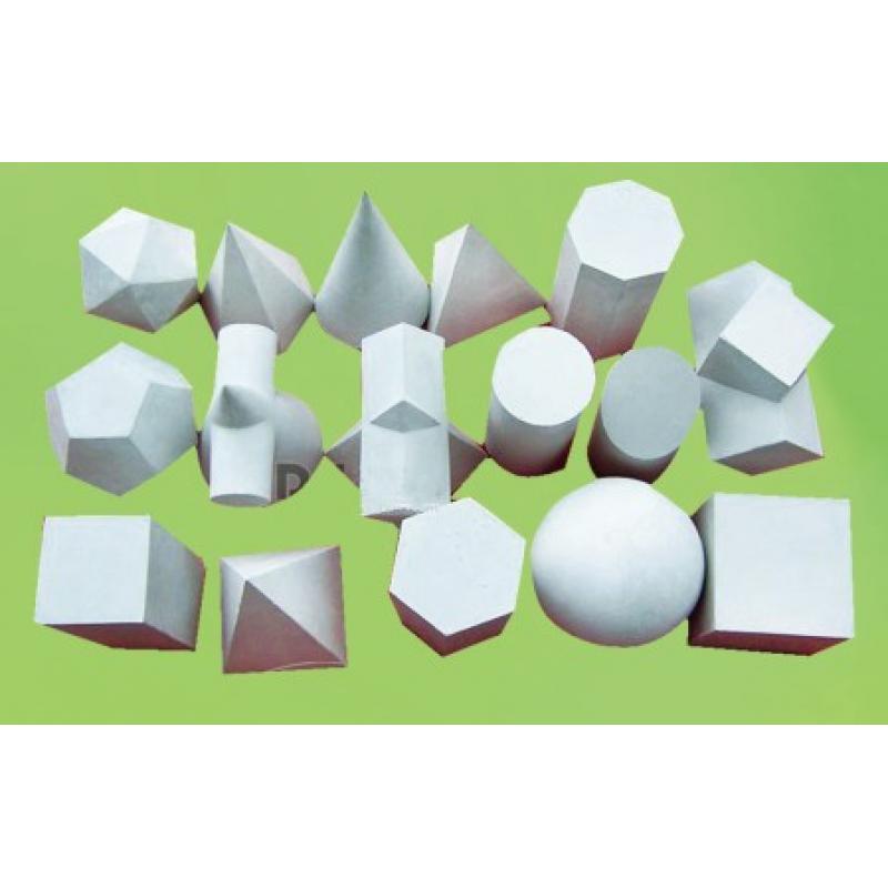 圓球、四棱錐、正方體、圓錐、長方體、圓柱體、六棱柱、方帶方、圓錐帶圓、方錐帶方、多面體、八棱柱、六棱錐、圓切、十二面體各一件
