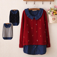 2014冬季新品女裝衛衣絨衫 日式翻領印花假兩件加厚抓絨套頭衛衣