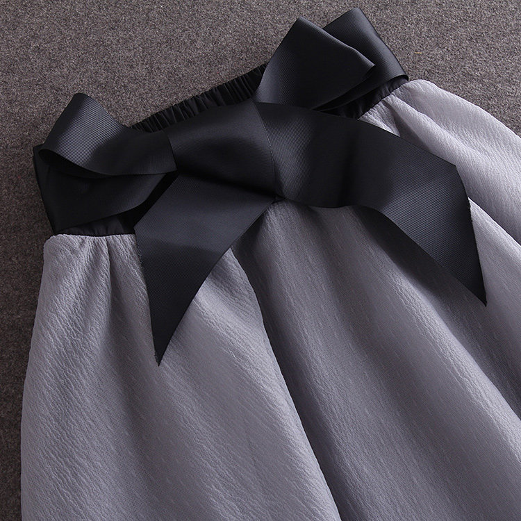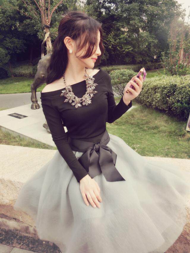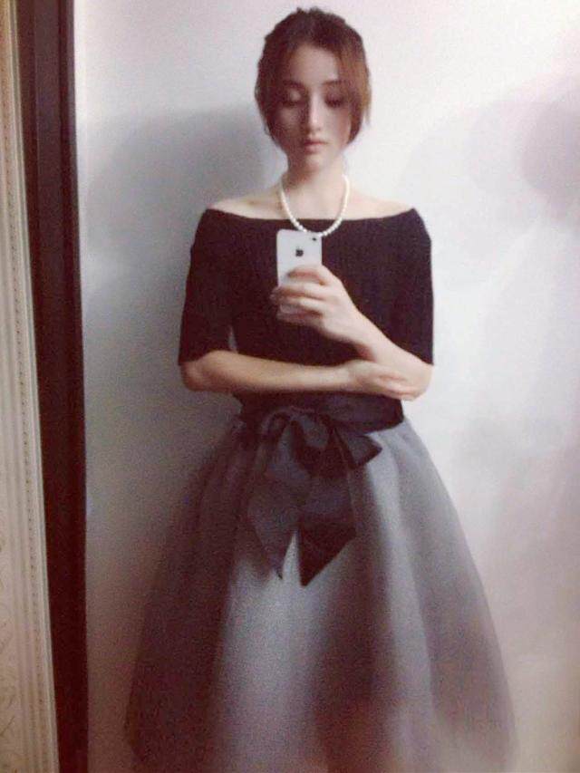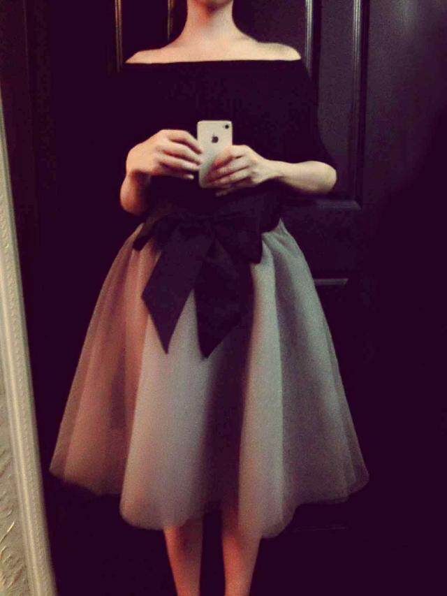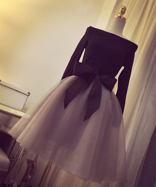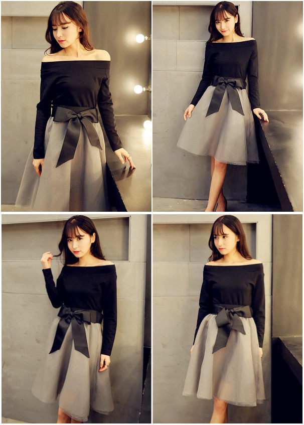 2015早春新款一字領修身黑色上衣 蝴蝶結系帶蓬蓬紗半裙套裝