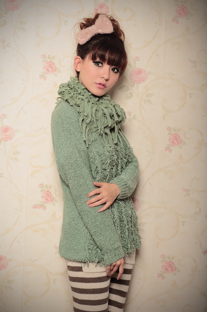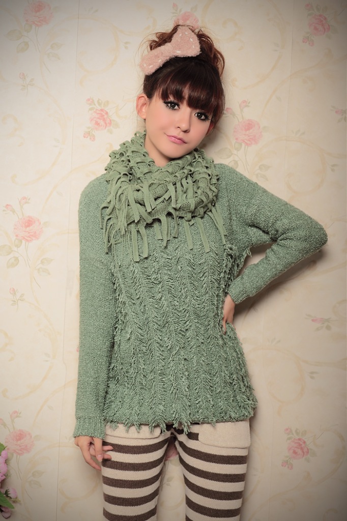 【四季青】女裝新款 豎條紋流蘇送圍脖拼接套頭毛衣批發703