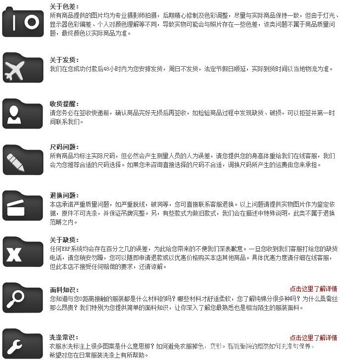 2.尺寸問題包換,請在收貨后24小時內確定,并在48小時內寄出,請買家保證物品包裝,吊牌等備件完整.費用:尺寸問題買家承擔雙程郵費.(選擇平郵在無質量問題的下不接受調換)