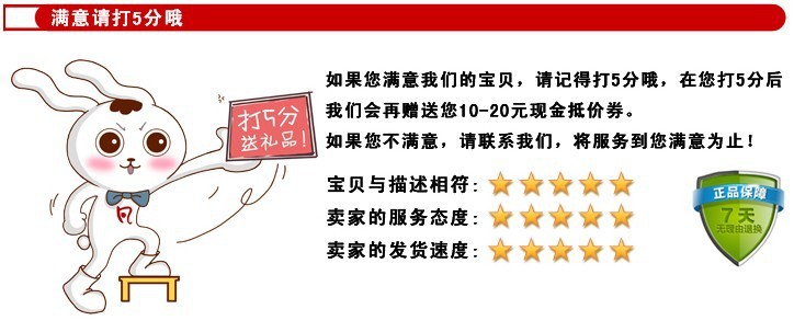 6.在收到產品,服務滿意的情況下,大家別忘了在評價,如果做得不周的,也歡迎大家給我提意見。我們將會努力做得更好! ((希望我們都能做到誠信為本,共同發展商道之路))