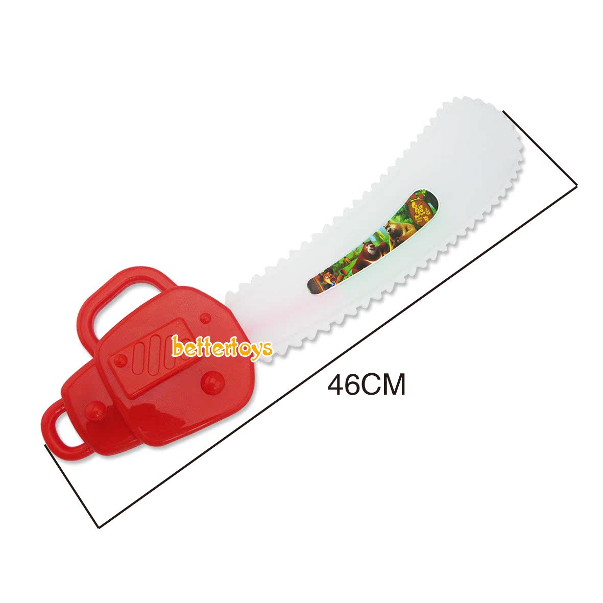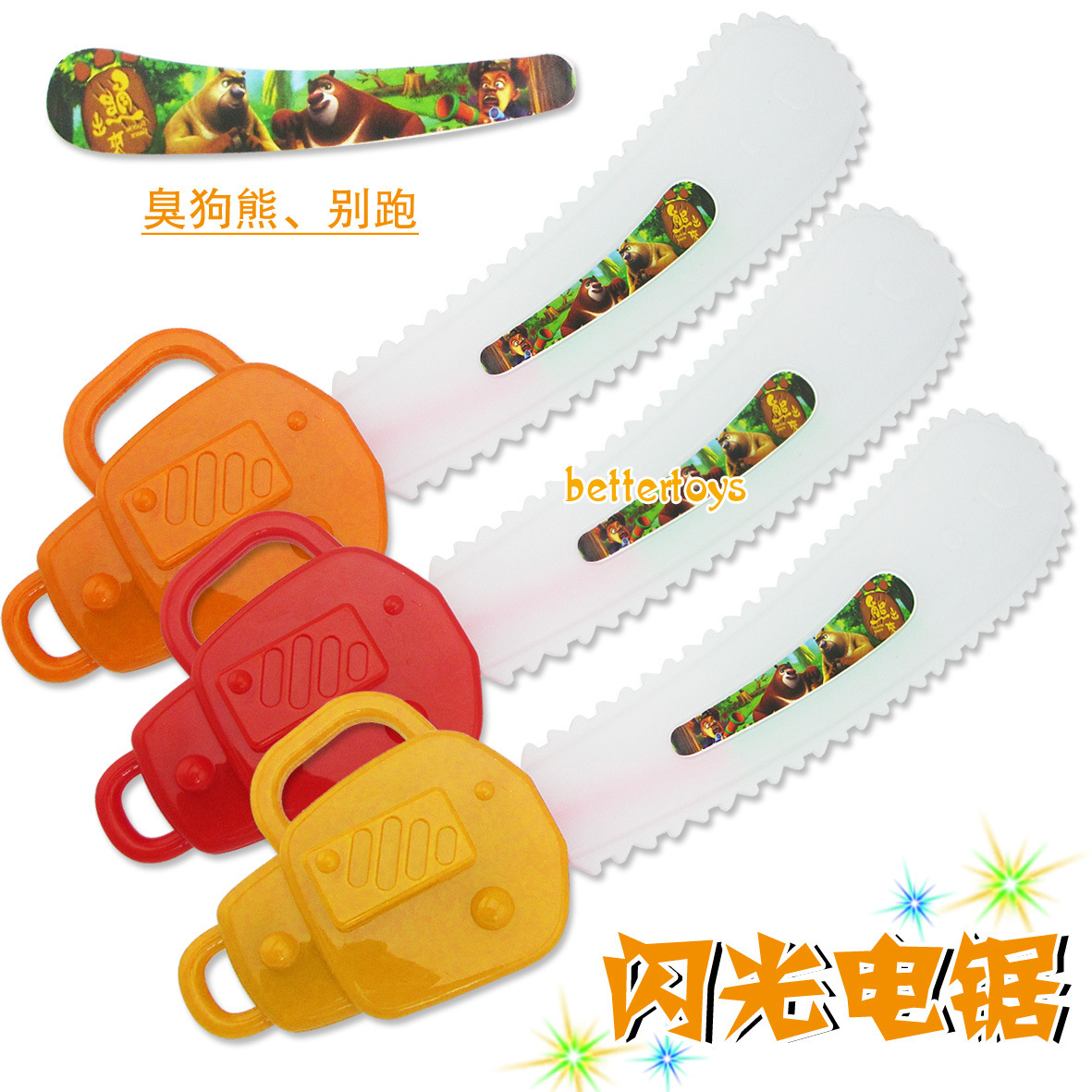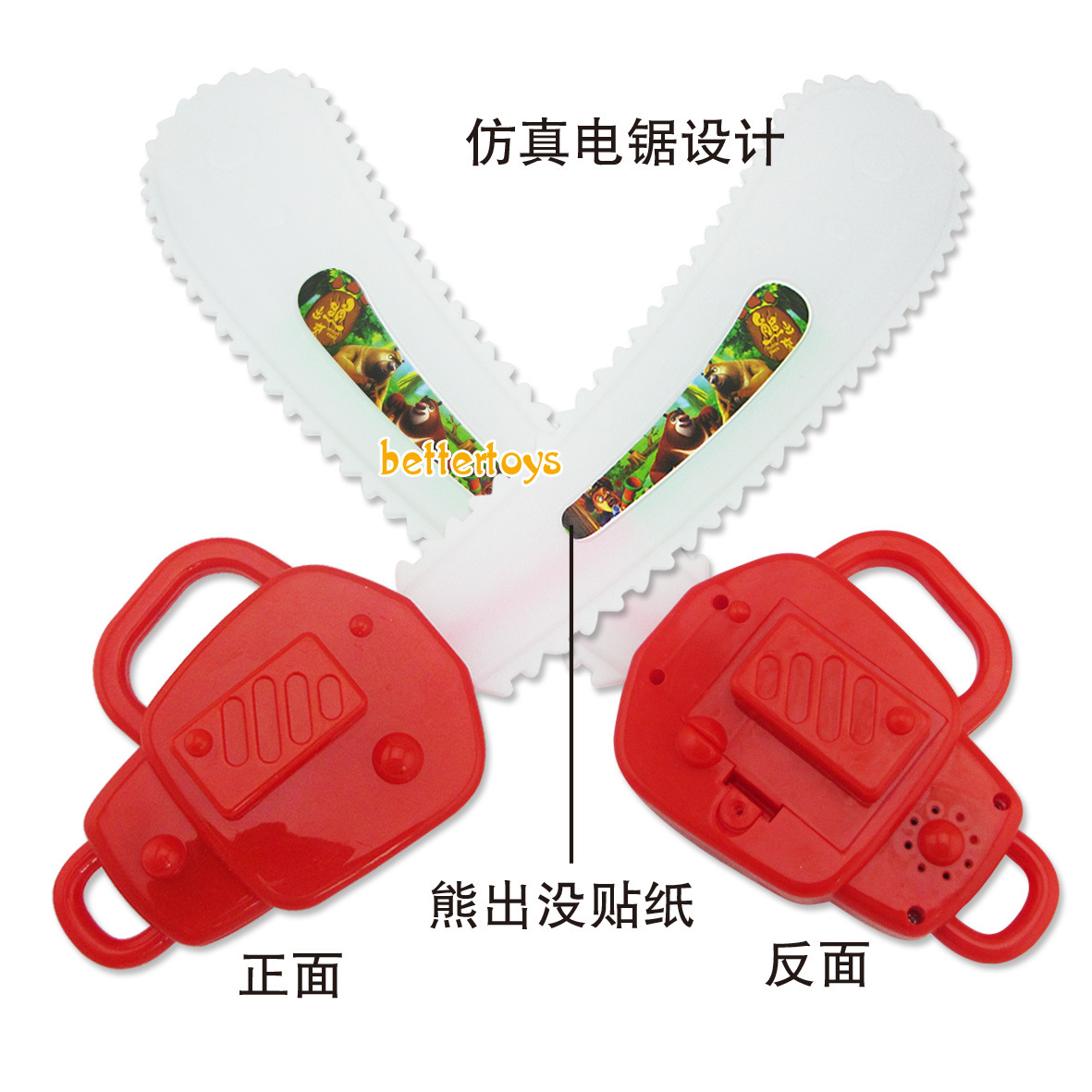 產品介紹:在電鋸的手柄處裝上3個5號電池(電池客戶自備或在本店購買) ,打開一個小小的黑色的開關,電鋸就會發出熊出沒的聲音(光頭強,熊大,站住,熊二,不許動),且帶有燈光的,是一款新款且熱賣中的產品)。