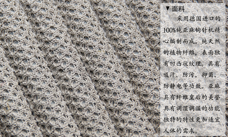 采用德國進口純亞麻鉤針機編制 凹凸狀紋理 吸汗 防污 抑菌 防靜電 有效調濕調溫 亞麻屬于純天然植物纖維 特性更適宜人體的需求 內填充蕎麥殼 明目 活血 久坐可緩解疲勞 亞麻具有纖維皇后的美譽 周邊與皮革相結合 凸顯氣質買家必看: