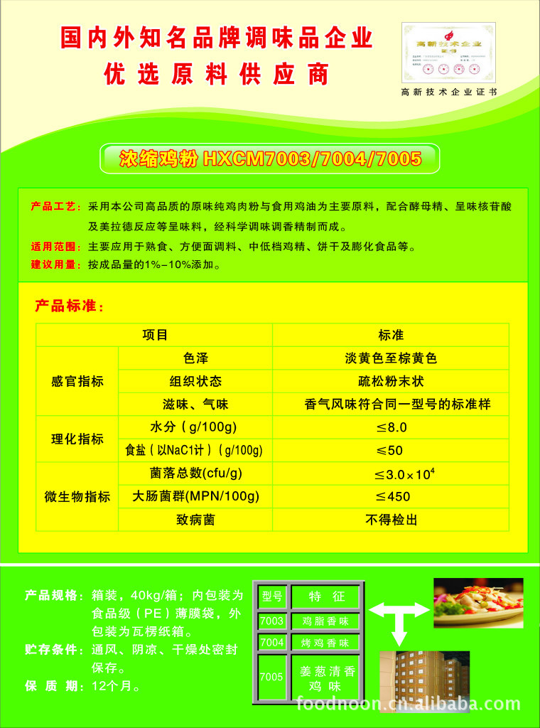 應用:(精)粉、雞汁、咸味香精、方便面調料、各式湯料等。