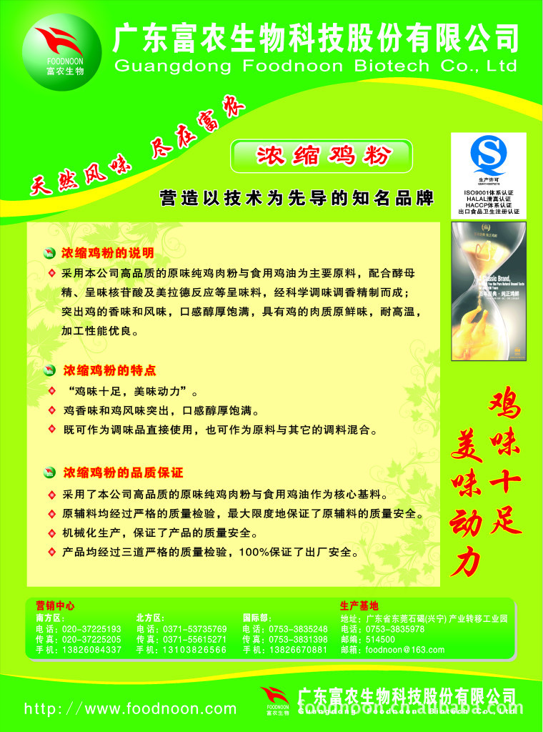 公司與中科院老專家技術中心、華南理工大學、仲愷農學院等多間大專院校和科研機構建立了長期的產學研合作關系,主持過星火計劃項目2項、農業綜合開發重點項目1項、廣東省農業攻關項目和星火計劃項目各1項,被省科技廳批準建立了“廣東省農業科技創新中心” ;禽產品綜合加工核心技術成果通過了廣東省科技成果鑒定;擁有兩項國家發明專利和一項實用新型專利;主產品雞肉粉、雞油通過ISO9001、 HACCP、QS和清真認證,產品質量及技術指標達到了進口同類產品水平,主要客戶為10多家跨國公司和國內大中型食品企業,客戶遍布全國各省市。