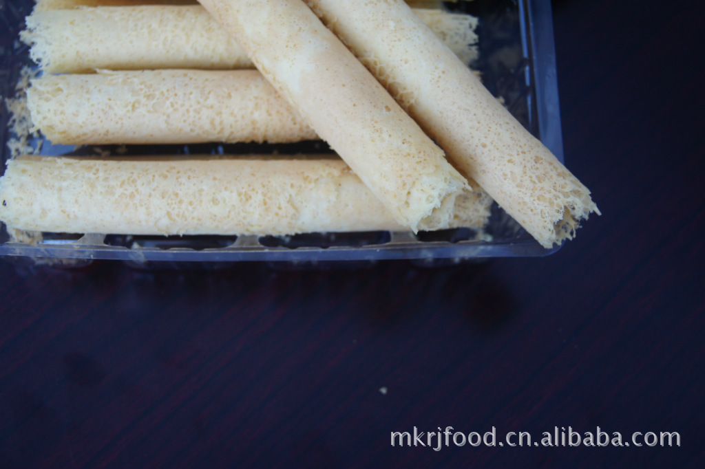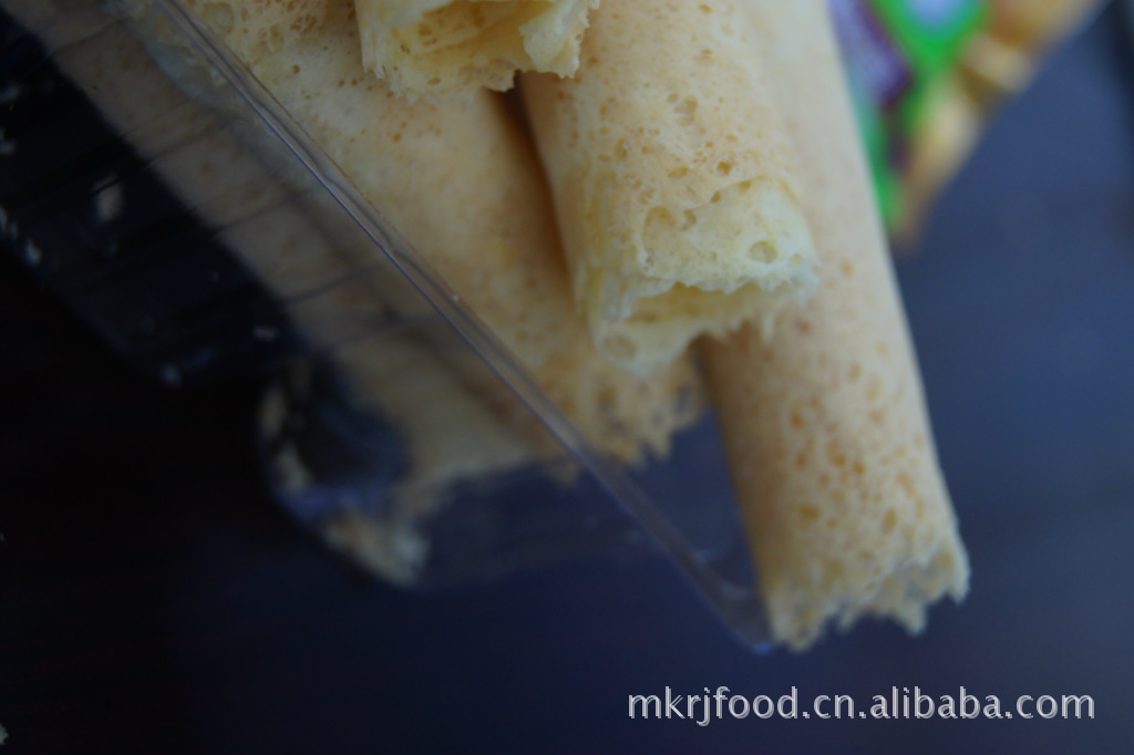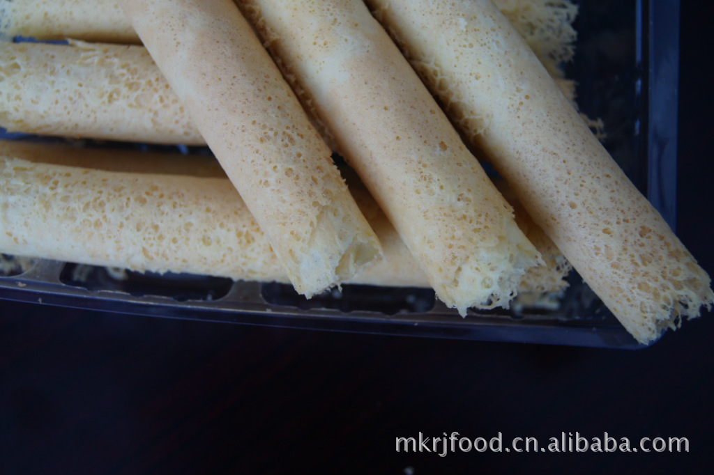 蛋卷制作就是活脫脫的民間手工藝,真正的好味,依然需要用手工來完成。過程其實并不復雜,其巧妙細節在于各家調制蛋漿時雞蛋的來源,面粉和糖和水的比例,有些亦加進可可脂,海苔。一般長身蛋卷會在一層卷好成型后再加卷上第二層,口感更加酥化,短身蛋卷會一次卷上三卷,做成硬凈脆身口感。