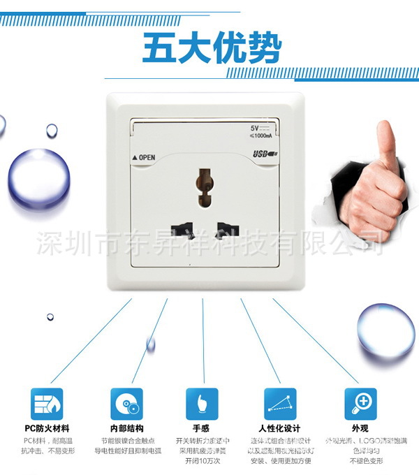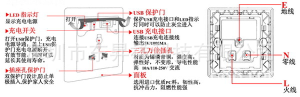5,可開啟的USB保護門,既起保護USB接口的作用,同時又是USB電源開關。開啟保護門即接通USB充電電源,關閉即切斷USB電源,節省空載功耗。