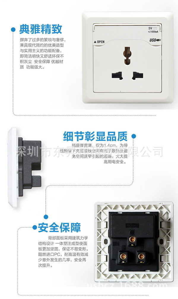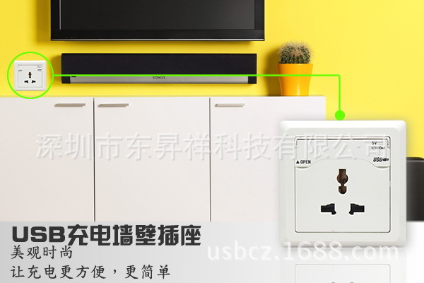 USB充電墻壁插座除了有創意的設計,還有穩定優異的質量,能應用在各種公、私場合,辦公樓、酒店、別墅、公寓和普通家居均可采用。USB充電墻壁插座的安裝簡單,與普通插座安裝方式相同,都可安裝在墻壁或桌面等位置。