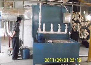 在噴涂過程中,混在氣體中的漆霧,當碰到水幕時漆霧被洗滌,漆被凝聚劑(客戶自備)聚成塊狀留在水中,另外引風機風力將水簾上的水幕通過文氏原理形成翻旋,使漆霧與水霧充分混合,然后通過噴淋及折流二級過濾,使氣、水分離,使空氣得到凈化,給予操作工一個潔凈的工作環境。