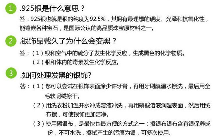 6、若使用拭銀布能夠恢復約八成的銀白狀況,就無需使用拭銀乳和洗銀水了,因為這些產品都具有一定的腐蝕性,銀飾在使用過這些產品之后,會越發容易變黃。拭銀布含有銀保養成份,不可水洗。