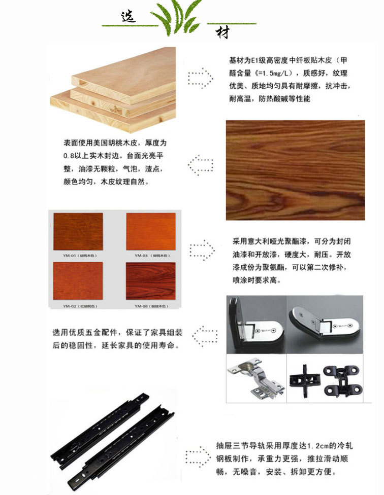 2、基材:采用優質高密度中纖板制作,甲醛釋放量達E1級環保,經防蟲防腐處理;