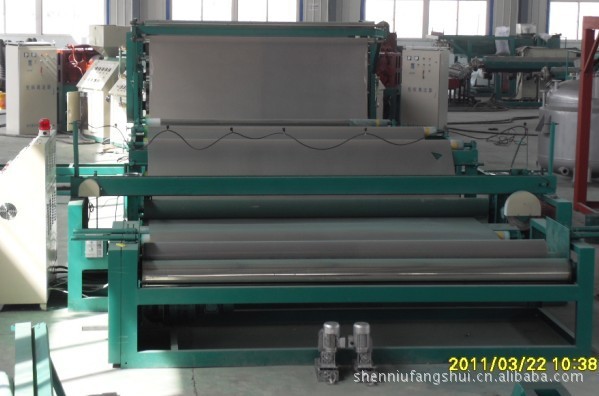 采用PVC、CPE、EVA、PE樹脂為基材,通過特殊的擠出生產工藝,使雙面的聚氯乙烯塑料層和中間的聚酯或玻纖加強筋結合成為一體而形成新型的高分子卷材。同時該設備可生產自粘防水卷材。此設備具有電子數控、自動化程度高、操作方便等綜合優勢。此設備生產的產品密實度高,表面平整、不起皺、性能穩定、質量可靠。