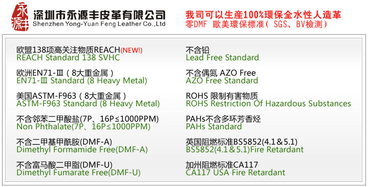 答:目前的人造革與合成革,都會添加化學產品,生產過程中都含有一定的化學元素存在,在某一方面來講也是屬于有害物質?,F時科學技術仍未能達到100%無毒, 但是我們都是能通過歐美出口標準的,2011年我司投產的全水性人造革幾乎能做到100%無毒,能出口到歐洲對環保要求最嚴格的國家,我司致力于環保革的生產與銷信,能為環保出一份力 ,是我們的榮幸。
