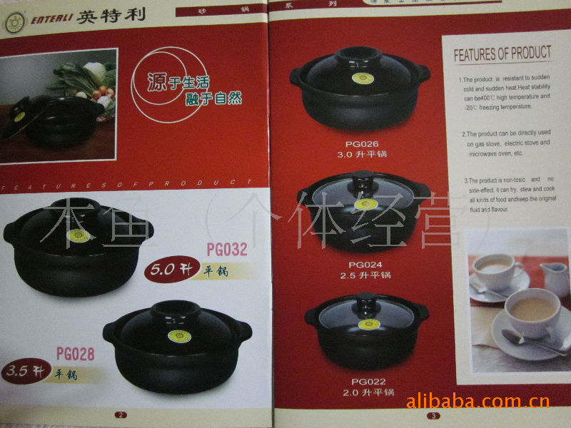 “英特利”耐砂鍋,產品系列繁多,產品經質量鑒定檢測合格。達到急熱400℃,急冷20℃無裂紋,熱穩定好、秞面雅潔、耐酸堿、不含鉛的特點;能保持食品的美味。