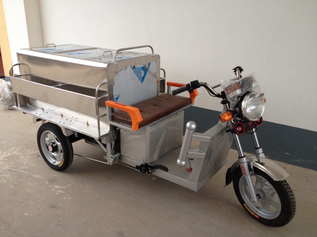 (4)整車自備:防盜器、儀表盤、照明燈、剎車燈、轉向燈、夜間行車燈。整車動力系統采用雙驅差速電機(48V/500W),有前進、倒退功能。載重爬坡能力強,結構設計合理,緊湊、節能、環保、省電、低噪音;用全鋼齒輪傳動。 箱體底部有鎖止機構,卸垃圾時將鎖扣開啟,達到卸垃圾的目的。為便于管理,電池組與車輛相配套使用,裝有鎖止功能,防止丟失。