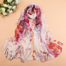 新款韓版優雅雪紡喬其圍巾 長款梅花牡丹 防曬披肩 女士時尚絲巾銷量5777