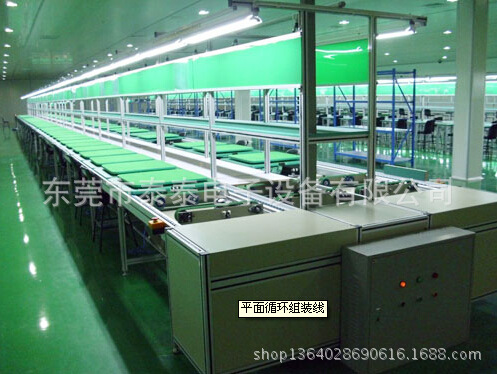 該組裝線為平面循環,可以順時針或者逆時針方向循環運行。兩邊是循環工裝板,中間配設有物料臺,可以擺放物料,測試儀器等。