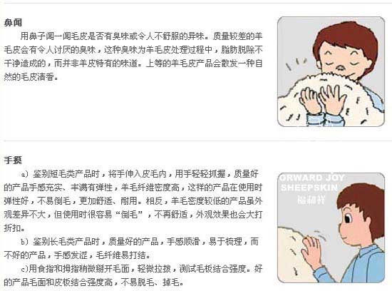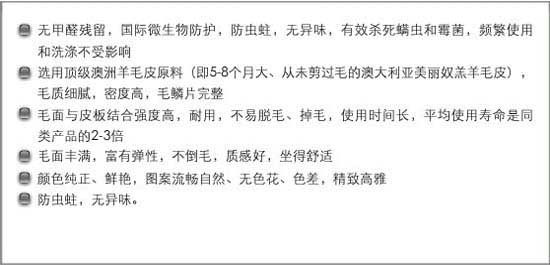 產品做工:產品原料選用澳大利亞優質羊皮,采用國際先進加工工藝,經國內外專業設計師設計,經過鞣制,洗染,疏整,整修等多道工序流程精致而成,含羊皮毛量100%