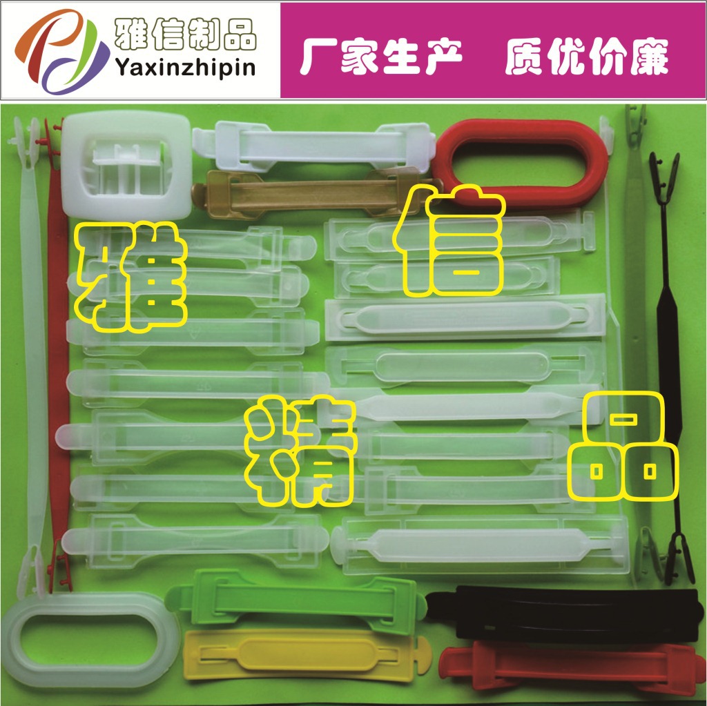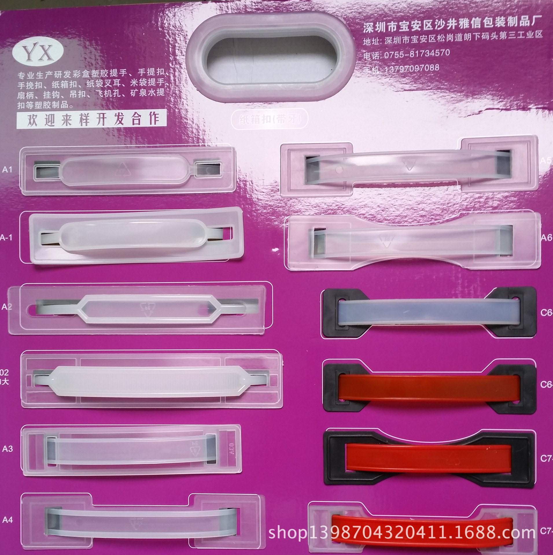我公司專業生產銷售各種彩盒、彩箱、手提袋/米袋/面粉袋配套專用塑料提手,塑膠提手扣、手提扣、手挽扣、手提把、手挽帶、紙箱扣環/扣手、拎手,各式塑膠吊扣、掛鉤、紙袋手挽,米袋扣手,面粉袋扣手等產品多達八十多款;“質量好,交貨快,價格平”同時承接樣板開發設計,加工等業務;歡迎來電咨詢。除透明之外,量大可以定做其他顏色。