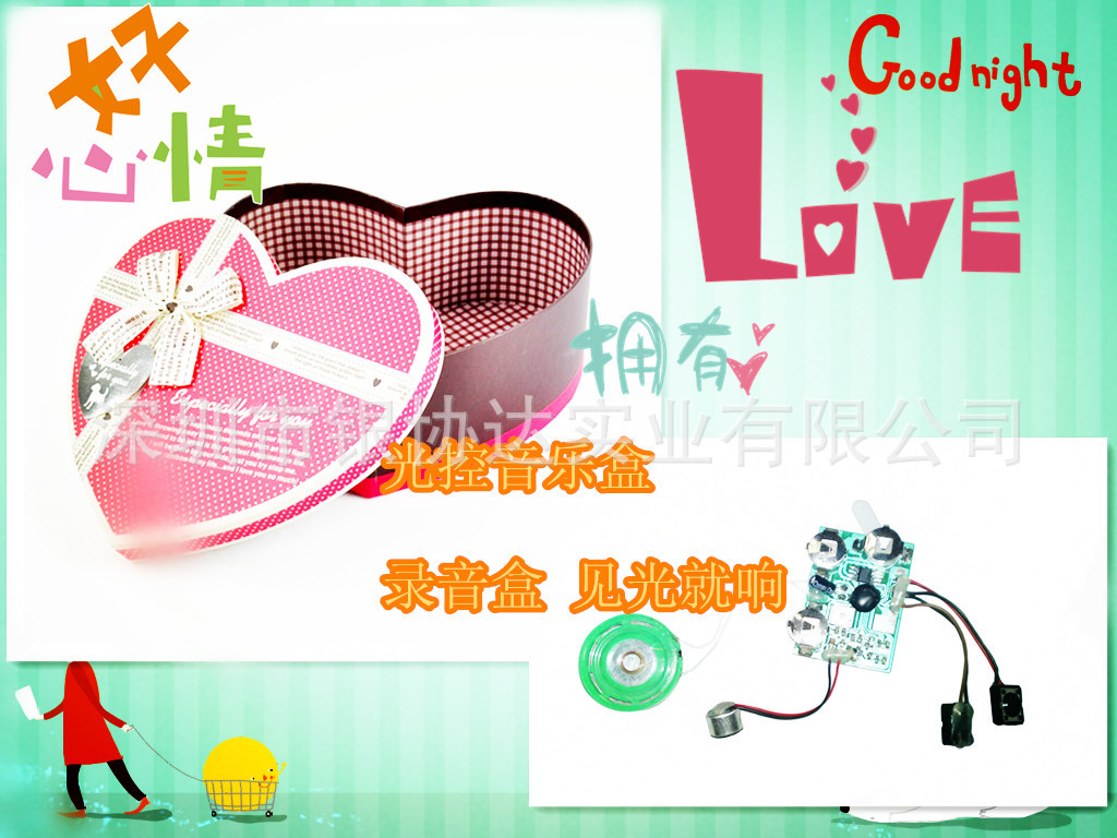 是專業開發、生產、銷售(玩具電子配件,發聲發光玩具機芯,音樂閃燈用品機芯,IC,COB,PCBA)。