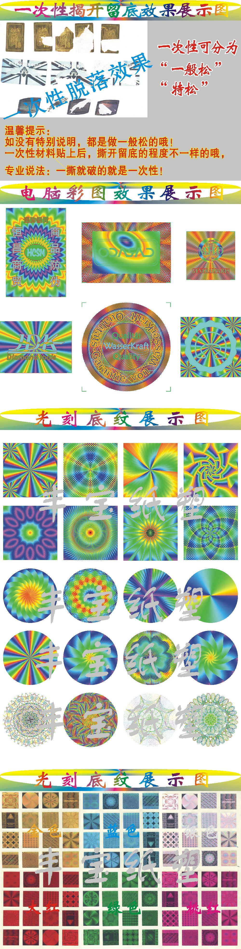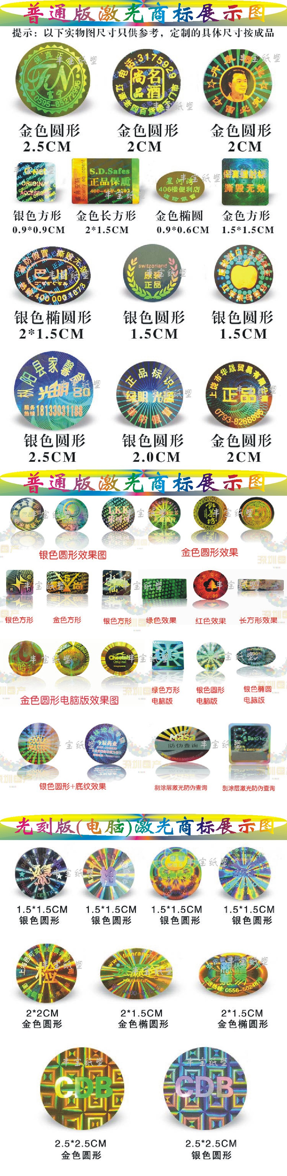 本廠專業制作激光防偽商標、電碼防偽商標、鏤空水洗防偽、不干膠印刷、螢光防對外承接激光制版、加溫變色、易碎紙商標、特種防偽、PET/OPP鐳射膜、透明鐳射膜、絲網印刷、紙盒、包裝袋、無紡布袋、泡泡貼、紋身貼、專定定制等產品專業生產加工的公司,擁有完整、科學的質量管理體系。蒼南縣龍港豐寶紙塑制品廠的誠信、實力和產品質量獲得業..