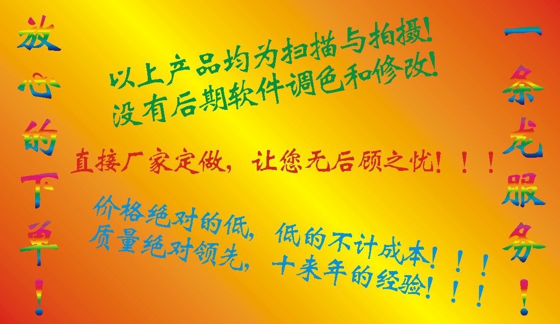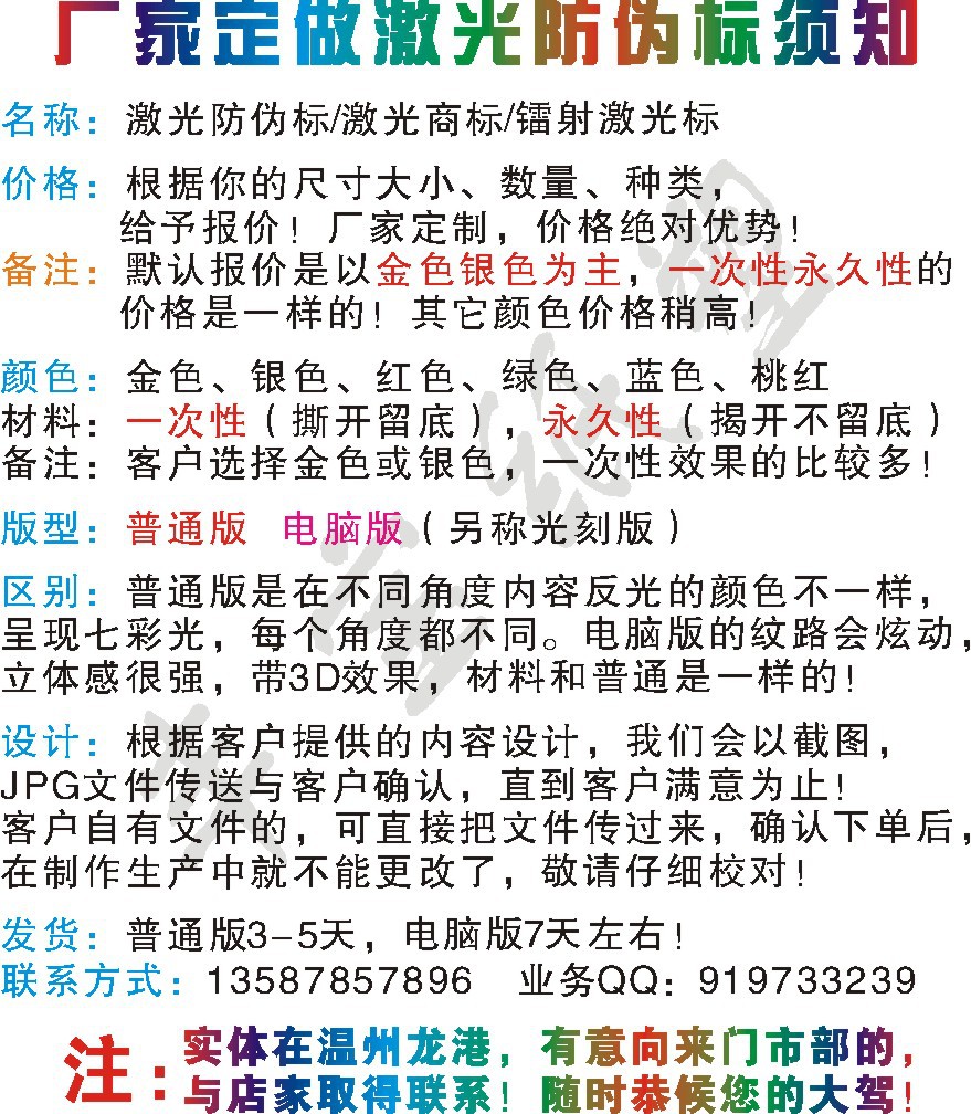 本廠專業制作激光防偽商標、電碼防偽商標、鏤空水洗防偽、不干膠印刷、螢光防對外承接激光制版、加溫變色、易碎紙商標、特種防偽、PET/OPP鐳射膜、透明鐳射膜、專定定制等產品專業生產加工的公司,擁有完整、科學的質量管理體系。蒼南縣龍港豐寶紙塑制品廠的誠信、實力和產品質量獲得業..