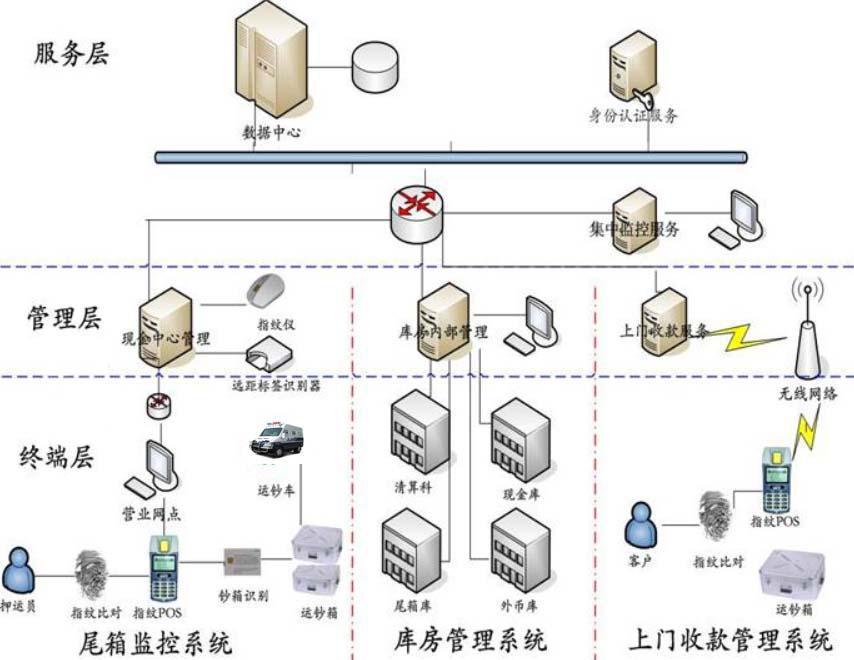 方式靈活:人員指紋識別、錢箱射頻監控可以通過無線網絡完成,從面便于提供流動網點服務。