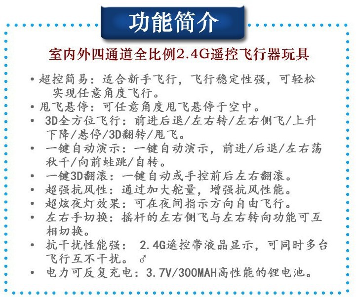 是一款具有創造性起飛模式的飛行器。采用程序,空中定位功能,可于任意角度隨意拋投飛行。另外還附有一鍵翻滾、一鍵自動演示等特技功能;超控簡單、可玩性強、具備便攜性、競技性。