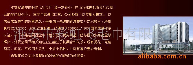 我廠是專門從事酒店毛巾四件套,浴袍,浴衣,毛毯,毛巾被等等巾類產品的生產與銷售。產品主要分為:平織,提花,繡花,割絨,色織,緞檔,提花,螺旋,螺旋提花等系列。