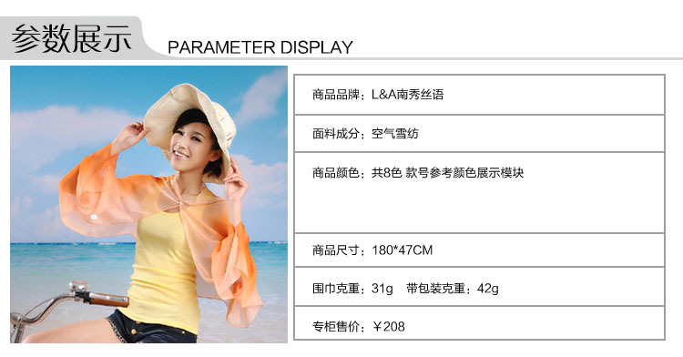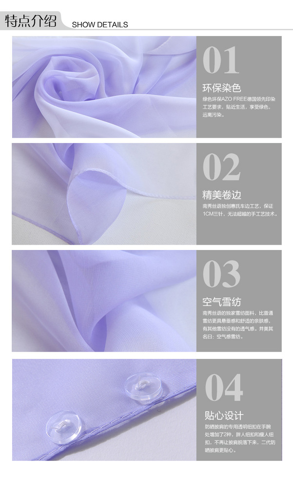 質地輕薄透明,手感柔順富有彈性,有良好的透氣性和懸垂性,兼具飄逸感,披肩上7個紐扣
