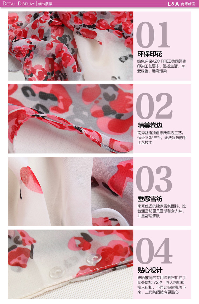 質地輕薄透明,手感柔順富有彈性,有良好的透氣性和懸垂性,兼具飄逸感,披肩上7個紐扣