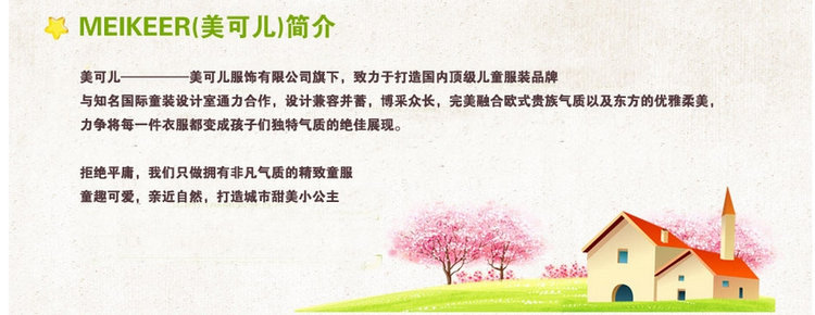5.我們美可兒主要做的是高檔100-150cm左右中大童產品和部分小童產品,質量優秀,款式精良,我們品牌的童裝是商場和大賣場的???,請不要拿那些低價,小版型,質量差的一般阿里供應商跟我們比價格,阿里巴巴只是我們多個銷售渠道中的一個,我們不屑與這類供應商為伍,我們做的是長久生意,賺良心錢,不做一錘子買賣!