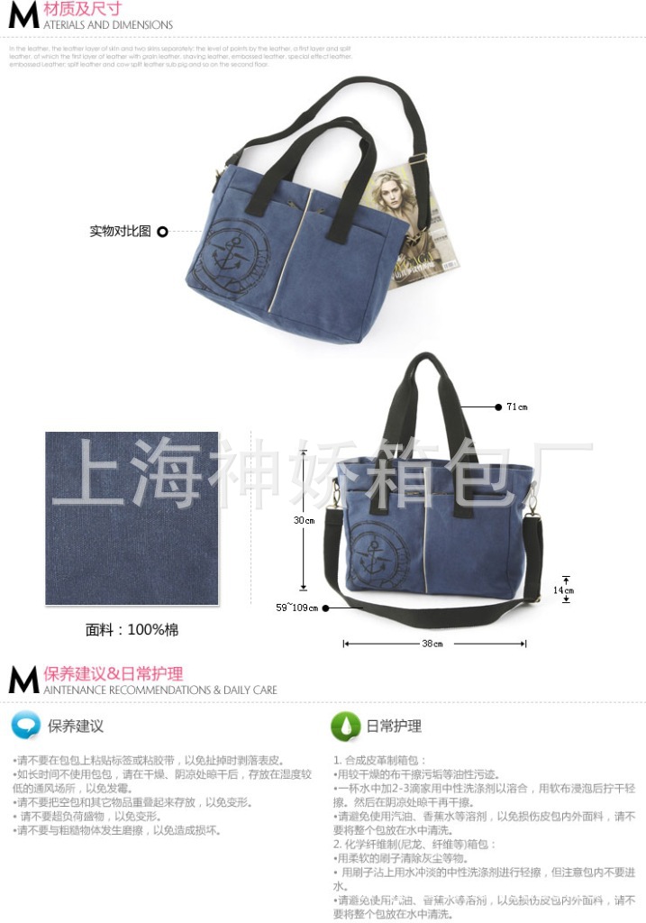 本款產品是優質600D牛津布,有一定的挺度。產品名稱】 100%滌綸牛津布【規格尺寸】 可根據客戶需要定制【產品顏色】 有多種布料可供選擇也可以訂做【布料規格】 布料厚度有300D-1680D安可供選擇。【小訂量】 1000只起訂【交貨周期】 確認打樣后8-15周內出貨【印刷工藝】 印刷可采用絲印,熱轉印,繡花,燙鉆,等其它印刷工藝【產品用途】 作為企業的資料袋或產品包裝袋【廣告效果】 可做為購物袋反復使用/宣傳上海神嬌箱包廠歡迎你來電咨詢。