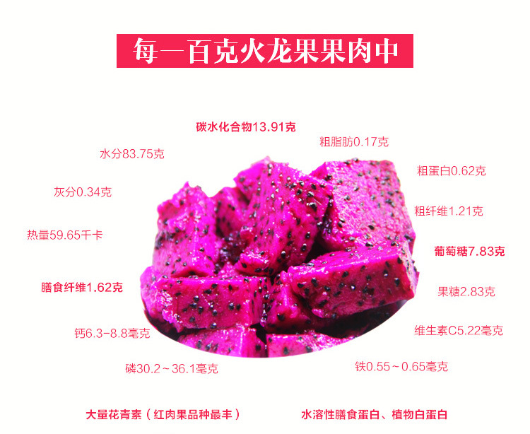 火龍果相當有益健康,其營養價值極高,含有豐富的鈣、磷、鐵…等礦物質和維他命族群,另外有一般植物少有的植物性蛋白、花青素和高量的水溶性膳食纖維。白蛋白是一種具有黏性和膠質性的物質,紅龍果的花、果、莖均屬於質地優良的植物性白蛋白,其對重金屬的污染有解毒的作用,對胃壁也有保護作用?;ㄇ嗨乇谎杆俚奈者M入人體血液後,會運送到各個部位組織,發揮抗氧化、抗自由基和抗衰老的作用,它也能提高對腦細胞病變的預防。抑制老年癡呆癥發生的水溶性膳食纖維,對瘦身減肥的人是極大的福音,更是糖尿病患少數可攝食的水果之一?;瘕埞姆N子內富含不飽和脂肪酸、抗氧化物質及各種等營養素。另外富含天然的色素,是高級口紅和化粧品的名貴材料。而以火龍果飼養的牛,其肉和牛乳可以以較高的價格出售?;瘕埞o上有白色小點的花苞,新鮮莖條絞汁加上蜂蜜飲用,有益健康,而花曬乾後可做料理,或直接沖泡熱水飲用。